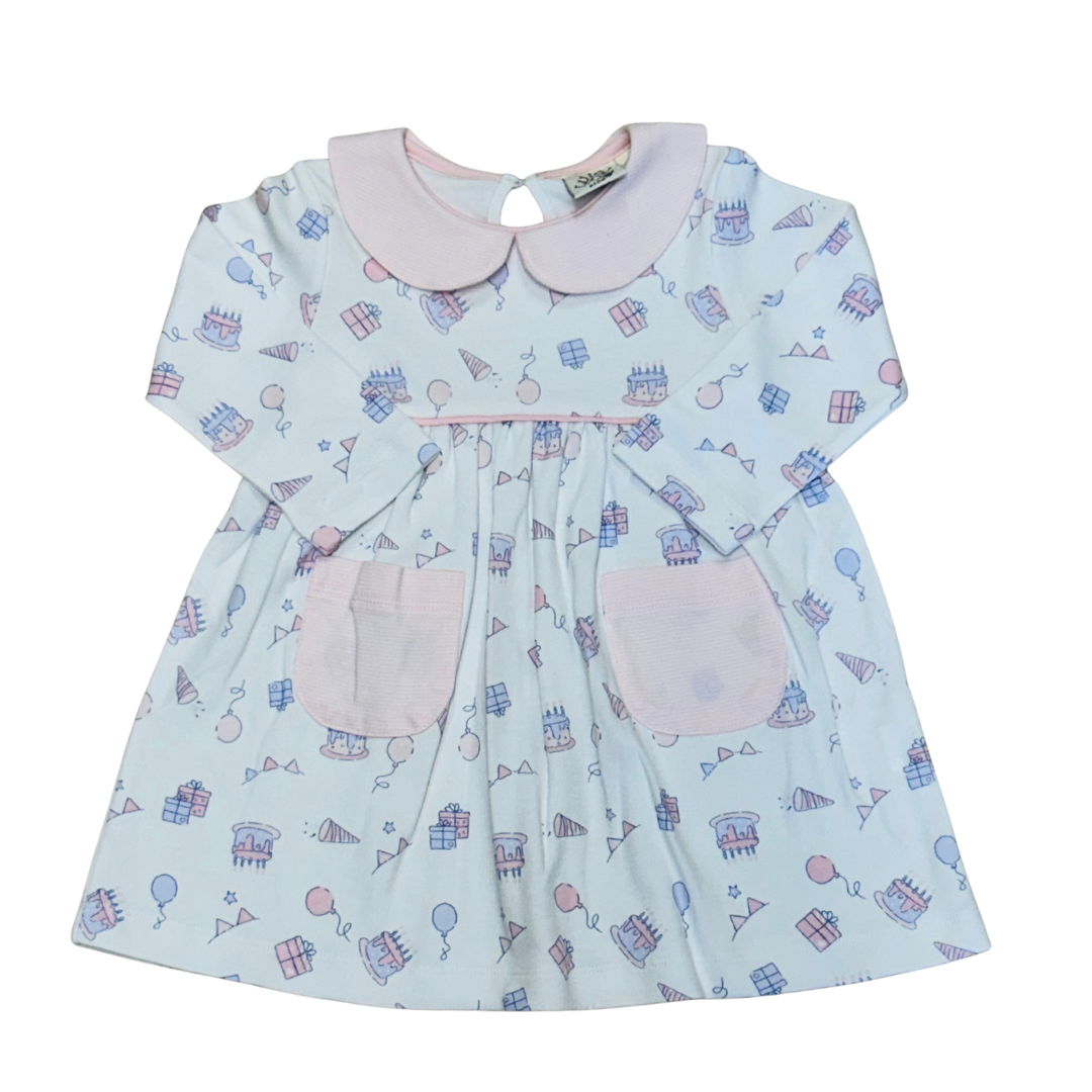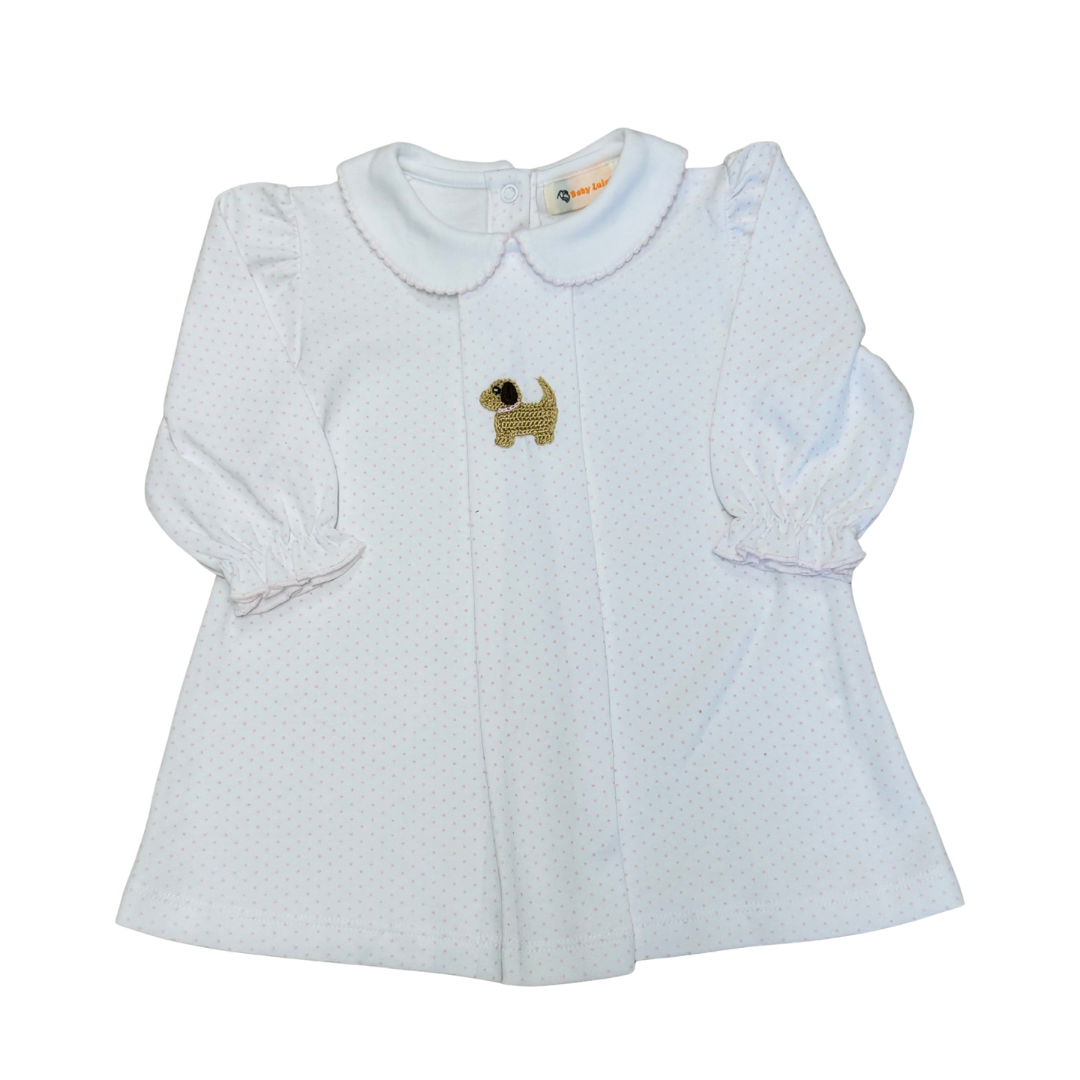 Pink Swiss Dot Dress w Dog Crochet Applique
