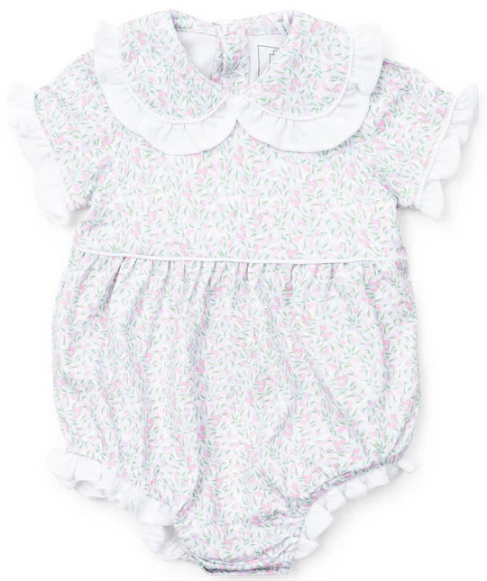 Girls' ruffled peter pan collar short sleeve pima bubble. Button closure in back and three snaps in the stride.