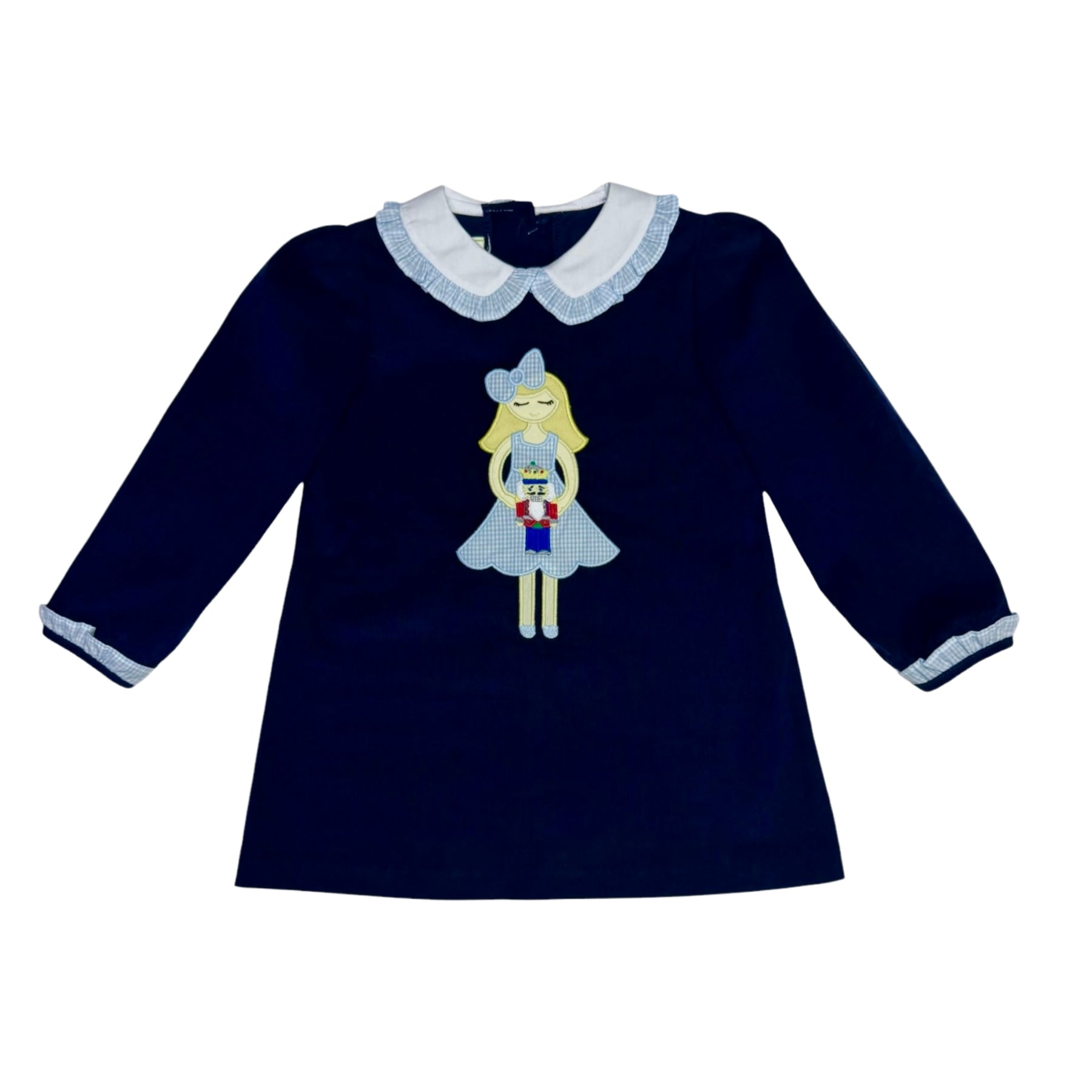 Stunning navy cord dress with gorgeous Clara applique and light blue details