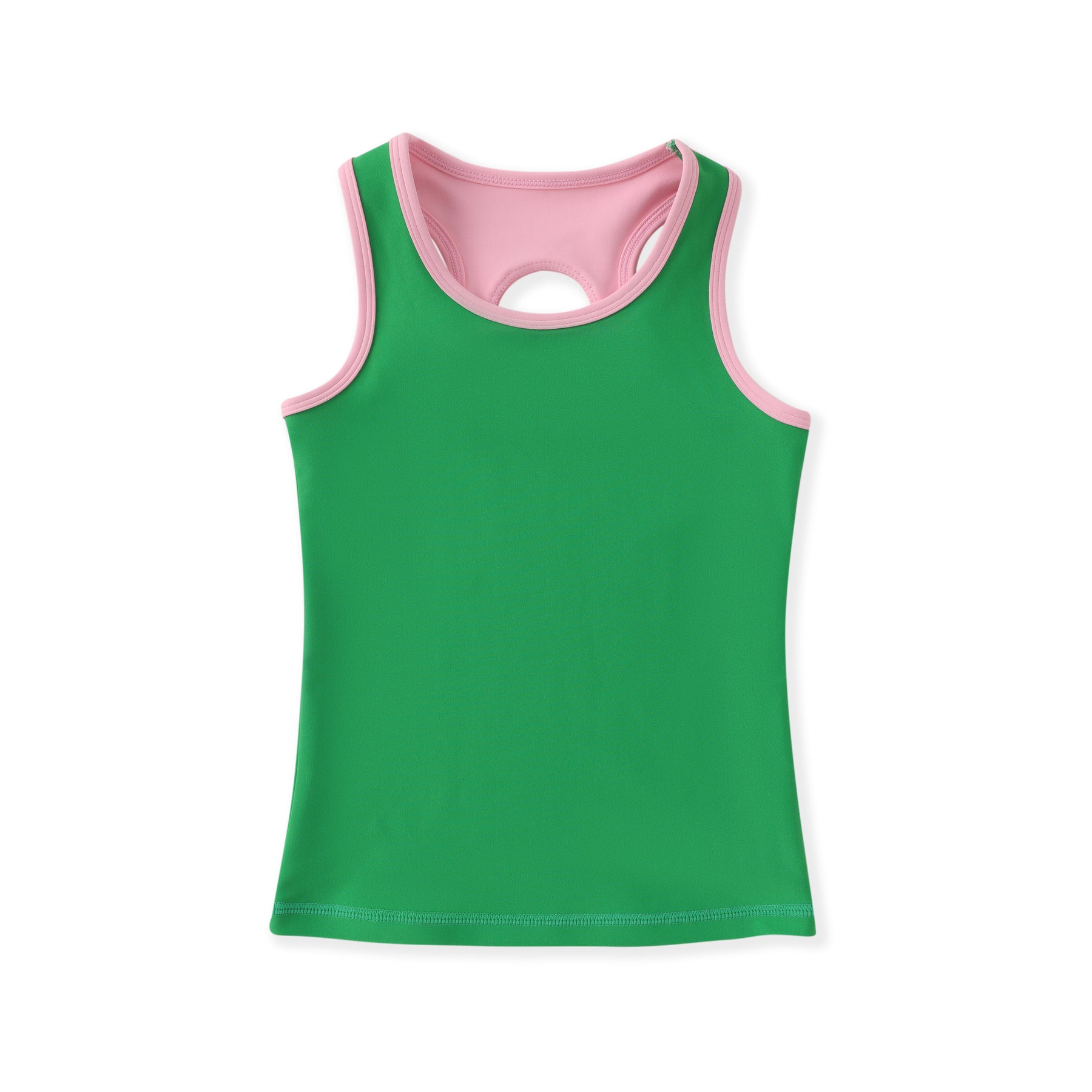 This sleeveless active tank is made for busy days, with a soft stretchy fabric that keeps kids comfortable while they run, jump, and play. The racerback design allows easy movement and makes it a great choice for sports, outdoor fun, or layering with skirts and shorts.